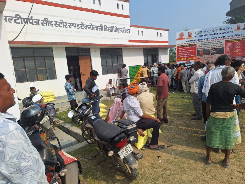 नवाबगंज विकासखंड क्षेत्र के मल्टीपरपज सीड स्टोर एंड टेक्नोलॉजी डिमॉन्स्ट्रेशन सेंटर पर आज गेंहू के बीज का वितरण कार्यक्रम प्रारंभ किया गया। कार्यक्रम में किसानों की भारी भीड़ देखी गई। सुबह से ही किसान बीज प्राप्त करने के लिए सेंटर पर पहुंचने लगे थे। कृषि विभाग के अधिकारियों की उपस्थिति में किसानों को गुणवत्तापूर्ण बीज वितरित किया जा रहा है। बताया गया कि पात्र किसानों को अनुदान दर पर गेंहू का बीज उपलब्ध कराया जा रहा है, जिससे आगामी रबी सीजन में अच्छी पैदावार हासिल की जा सके। इस मौके पर अधिकारियों ने किसानों को उन्नत कृषि तकनीक और समय पर बुवाई के महत्व के बारे में भी जानकारी दी। सेंटर पर व्यवस्था बनाए रखने के लिए स्थानीय प्रशासन की ओर से आवश्यक प्रबंध किए गए हैं।